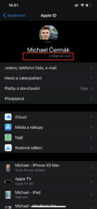 Pokud si chcete zkontrolovat, jaké Apple ID používáte, přejděte do Nastavení -> nahoře vyberte své jméno a zde zkontrolujte, zda se jedná o váš účet.