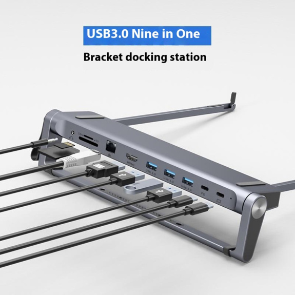 Chcete doručiť tovar na Slovensko? Prezrite si Rozbočovač T12U 9v1 s výklopným stojanom - slot na kartu SD / TF / RJ45 / HDMI / 3,5 mm jack / USB-C / 3x USB-A na USB-C - sivý na AppleKing.sk.